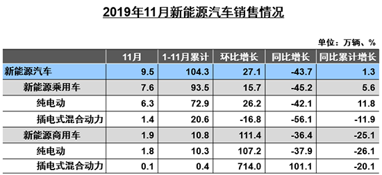 值得關(guān)注的是,新能源汽車在11月出現(xiàn)“五連降”,且降幅進(jìn)一步擴(kuò)大。數(shù)據(jù)顯示,11月,新能源汽車產(chǎn)銷分別完成11萬輛和9.5萬輛,同比分別下降36.9%和43.7%。其中純電動汽車產(chǎn)銷分別完成9.6萬輛和8.1萬輛,同比分別下降29.6%和41.2%;插電式混合動力汽車產(chǎn)銷均完成1.4萬輛,同比分別下降63%和54.4%。