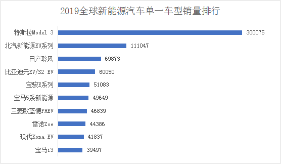 從單一產(chǎn)品銷(xiāo)量看,全球排名前五的全部都是純電動(dòng)車(chē)型。特斯拉Model 3以300075輛的業(yè)績(jī)名列榜首,其次為北汽新能源EU系列,年銷(xiāo)111047輛。到目前為止,在全球所有的新能源車(chē)型中,只有這兩款的年銷(xiāo)量達(dá)到10萬(wàn)以上。同時(shí),這也是中國(guó)新能源汽車(chē)單一車(chē)型年度銷(xiāo)量首次突破10萬(wàn)大關(guān)。