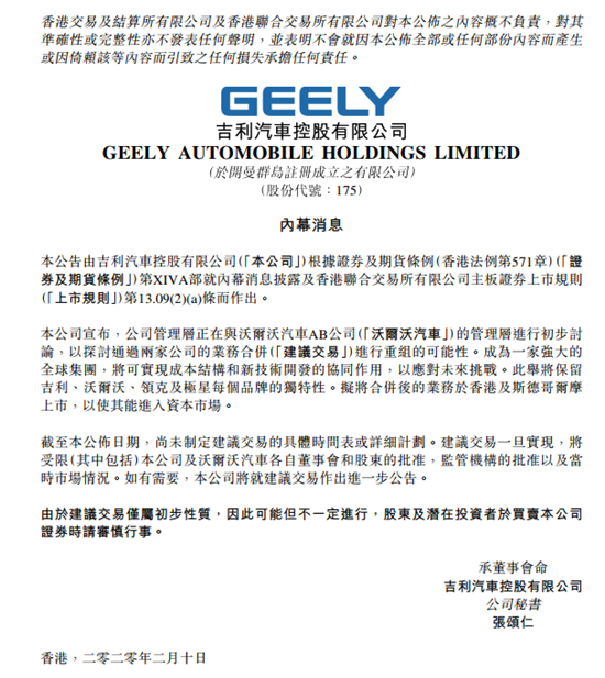 公告同時(shí)表示,截至本公布日期,尚未制定建議交易的具體時(shí)間表或詳細(xì)計(jì)劃。建議交易一旦實(shí)現(xiàn),將受限本公司及沃爾沃汽車各自董事會和股東的批準(zhǔn),監(jiān)管機(jī)構(gòu)的批準(zhǔn),以及當(dāng)時(shí)市場情況。