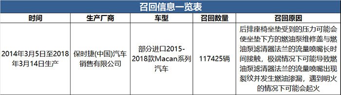 本次召回范圍內(nèi)的部分車輛在使用時(shí),后排座椅坐墊受到的壓力可能會(huì)使坐墊下方的燃油泵維修蓋與燃油泵濾清器法蘭的流量噴嘴長(zhǎng)時(shí)間接觸,極端情況下可能導(dǎo)致燃油泵濾清器法蘭的流量噴嘴出現(xiàn)裂紋并發(fā)生燃油滲漏,遇到明火的情況下可能會(huì)起火,存在安全隱患。保時(shí)捷(中國)汽車銷售有限公司將為召回范圍內(nèi)的車輛免費(fèi)檢修或更換燃油泵維修蓋;同時(shí)檢查燃油泵濾清器法蘭的流量噴嘴處是否有裂紋,如有裂紋則更換燃油泵濾清器法蘭,以消除安全隱患。由于配件籌備的原因,在2020年10月之前對(duì)涉及的車輛免費(fèi)檢修燃油泵維修蓋;在此之后,對(duì)涉及的車輛免費(fèi)更換改進(jìn)后的燃油泵維修蓋。