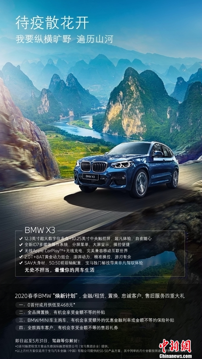 日前,據(jù)華晨寶馬官方消息,即日起至5月31日, BMW推出“煥新計(jì)劃”,針對BMW X3制定專屬用車方案及“大禮包”,0首付即可享用。