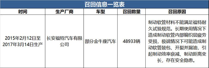 日前,長安福特汽車有限公司根據(jù)《缺陷汽車產(chǎn)品召回管理?xiàng)l例》和《缺陷汽車產(chǎn)品召回管理?xiàng)l例實(shí)施辦法》的要求,向國家市場監(jiān)督管理總局備案了召回計(jì)劃。決定自2020年4月7日起,召回2015年2月12日至2017年3月14日期間生產(chǎn)的部分金牛座汽車,共計(jì)48933輛。