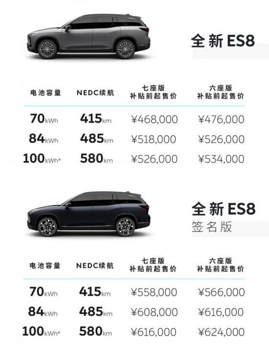 2020款ES8配備70kWh電池組車型的NEDC續(xù)航達415km的,84kWh電池組車型NEDC續(xù)航達485km。同時,新增100kWh電池組車型的NEDC續(xù)航里程更是高達580km。