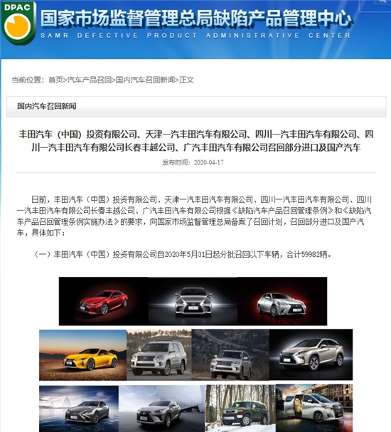 4月17日,豐田中國宣布召回25萬低壓燃油泵存在缺陷的汽車。本次召回范圍內部分車輛,由于在低壓燃油泵葉輪的制造過程中樹脂成型條件不完善,導致葉輪樹脂密度不足。葉輪可能會受燃油影響而發(fā)生膨潤變形,并與低壓燃油泵殼體發(fā)生干涉,導致低壓燃油泵工作不良,極端情況下可能出現(xiàn)車輛行駛中發(fā)動機熄火的情況,存在安全隱患。