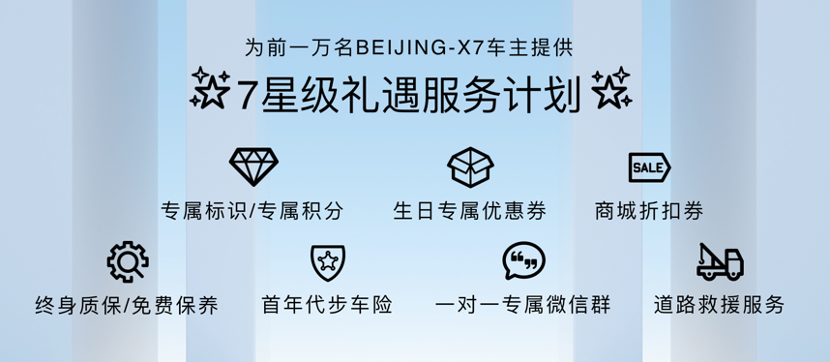 發(fā)布會當日,BEIJING汽車發(fā)布面向首批一萬名BEIJING-X7車主的“七星級禮遇服務計劃”,以線上的尊榮特權和線下的無憂守護,回饋車主信賴。