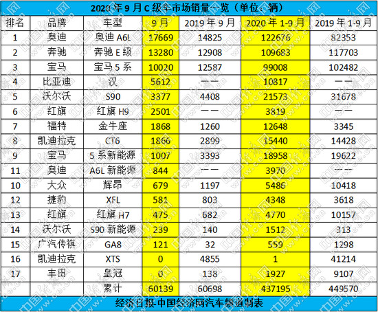 整體來看,9月,國產(chǎn)C級(jí)車整體銷量為60139輛,環(huán)比下滑3.2%,與去年同期相比微降0.92%;今年前三個(gè)季度的累計(jì)銷量為437195輛,同比下滑2.75%,基本追平去年同期水平。
