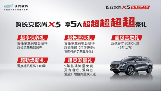為了能夠讓用戶(hù)在用車(chē)方面消除后顧之憂,在上市當(dāng)天,長(zhǎng)安歐尚X5還推出了超享保養(yǎng)禮、超長(zhǎng)質(zhì)保禮、超級(jí)金融禮、超勁煥新禮、超爽流量禮五大超豪禮購(gòu)車(chē)福利,在高價(jià)值產(chǎn)品之外,保障每位用戶(hù)都能實(shí)現(xiàn)輕松購(gòu)車(chē)、省心用車(chē)。