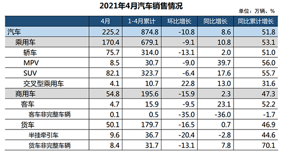 具體來看,4月,我國汽車產(chǎn)銷分別達(dá)到223.4萬輛和225.2萬輛,環(huán)比下降9.3%和10.8%,同比增長6.3%和8.6%;1-4月,汽車產(chǎn)銷分別完成858.6萬輛和874.8萬輛,同比分別增長53.4%和51.8%,增幅比1-3月回落28.3和23.8個(gè)百分點(diǎn)。