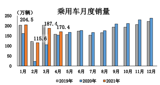 1-4月,乘用車產(chǎn)銷分別完成666.8萬輛和679.1萬輛,同比分別增長55.3%和53.1%。增幅比1-3月回落27.8和22個(gè)百分點(diǎn)。與2019年同期相比,產(chǎn)銷同比分別下降3.4%和0.9%,降幅較1-3月分別減小2.1和2.9個(gè)百分點(diǎn)。