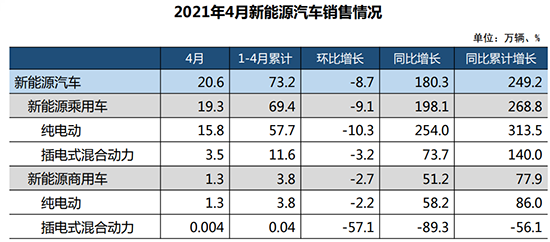 相比汽車整體,新能源依然呈現(xiàn)倍速增長。4月,新能源汽車產(chǎn)銷分別完成21.6萬輛和20.6萬輛,同比分別增長1.6倍和1.8倍,繼續(xù)刷新當(dāng)月歷史記錄;1-4月,新能源汽車產(chǎn)銷分別完成75萬輛和73.2萬輛,同比分別增長2.6倍和2.5倍。陳士華表示,無論是傳統(tǒng)車企,還是造車新勢力都十分重視新能源,并不斷推出新車型,這些車型受到了消費(fèi)者的認(rèn)可,大家購買積極性很高。