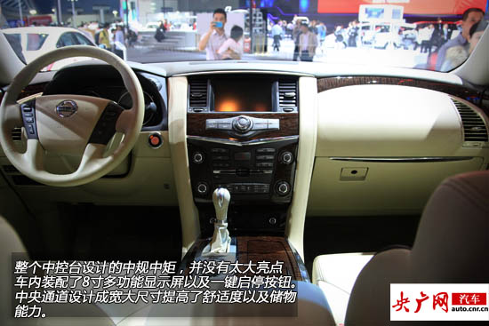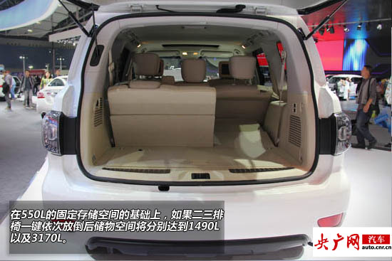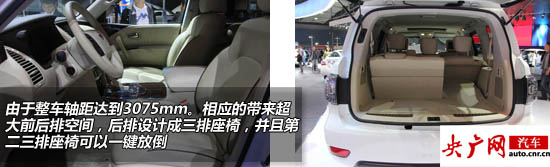 此款車型為三排座車型,第二,三排座可以通過(guò)自動(dòng)按鍵一鍵放倒進(jìn)一步增大儲(chǔ)物空間。車內(nèi)配備三屏智能影音娛樂(lè)系統(tǒng),13揚(yáng)聲器BOSE高保真音響系統(tǒng),三區(qū)自動(dòng)空調(diào),座椅以及方向盤加熱系統(tǒng),6.0L雙向開啟車載冰箱。安全性配置也與現(xiàn)款車型基本一致,智能行車安全輔助系統(tǒng),NAVI智行系統(tǒng)以及日產(chǎn)的“CARWINGS智行”系統(tǒng)。多重靜音技術(shù)能夠達(dá)到靜謐的行駛空間。