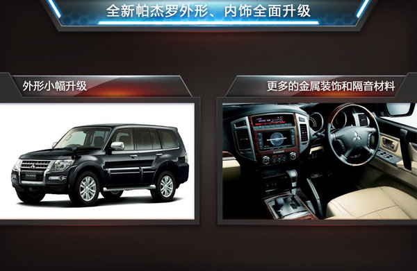 較新款歐藍德相比,改款帕杰羅的調(diào)整也算大相徑庭。同樣針對前保險杠與前進氣格柵進行修改,前臉整體風格更顯厚重。高配車型尾部配備有LED尾燈組和全新的背負式備胎罩。內(nèi)飾方面,新款帕杰羅應用了更多的金屬裝飾和隔音材料,高配車型還采用鋼琴黑的內(nèi)飾顏色和木紋裝飾等改動。