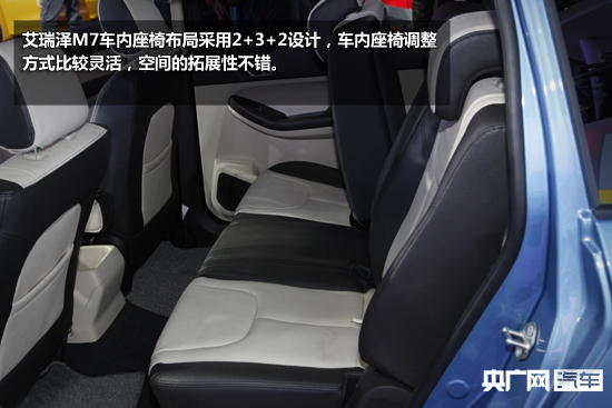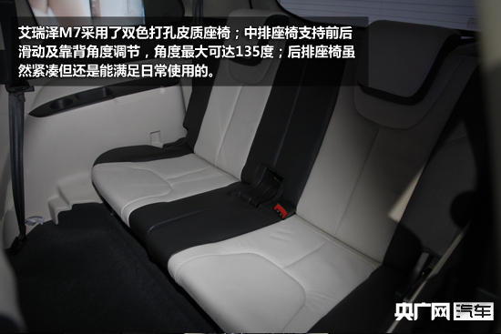 艾瑞澤M7采用了雙色打孔皮質座椅,質感不錯;中排座椅支持前后滑動及靠背角度調節(jié),角度最大可達135度,很人性化,第三排沒有乘客的情況下中排乘客可以享受超大空間。 艾瑞澤M7車內座椅布局采用2+3+2設計,行李箱容積為588升,第二排和第三排座椅放倒后,能擴展到2240升,不僅能夠滿足日常出行,裝點貨物也完全沒問題。