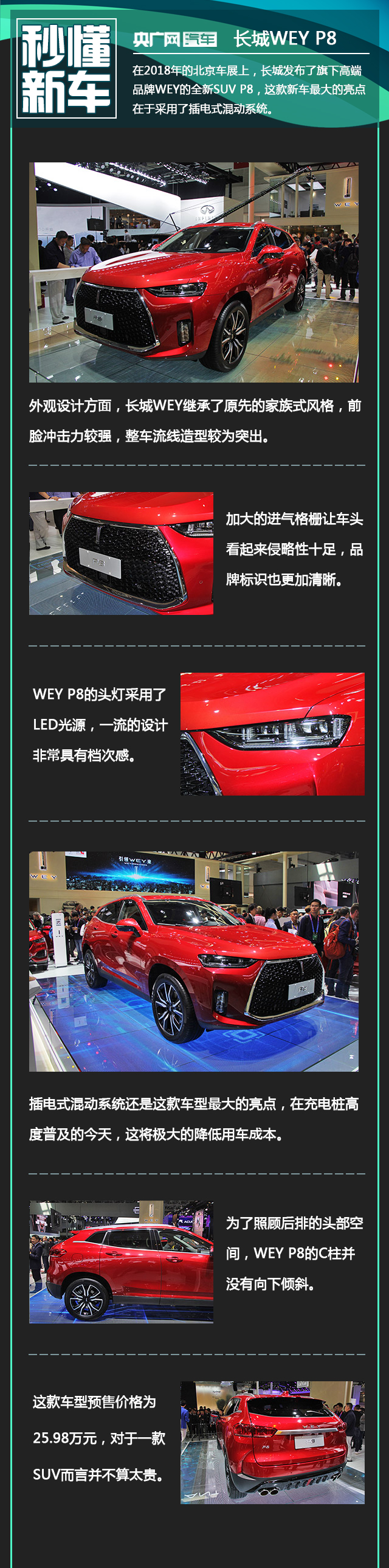 WEY P8上市正式上市 補(bǔ)貼后統(tǒng)一售25.98-27.98萬,【環(huán)球網(wǎng)汽車 新車上市】2018年4月22日,長城旗下WEY品牌首款混合動(dòng)力四驅(qū)SUV——WEY P8正式上市,售價(jià)為29.28-31.28萬元,補(bǔ)貼后全國統(tǒng)一售價(jià)25.98-27.98萬元。新車基于全新WEY Pi4平臺(tái)打造,搭載2.0T直噴發(fā)動(dòng)機(jī)+后軸驅(qū)動(dòng)電機(jī)的四驅(qū)插電式混合動(dòng)力總成,定位中型SUV。