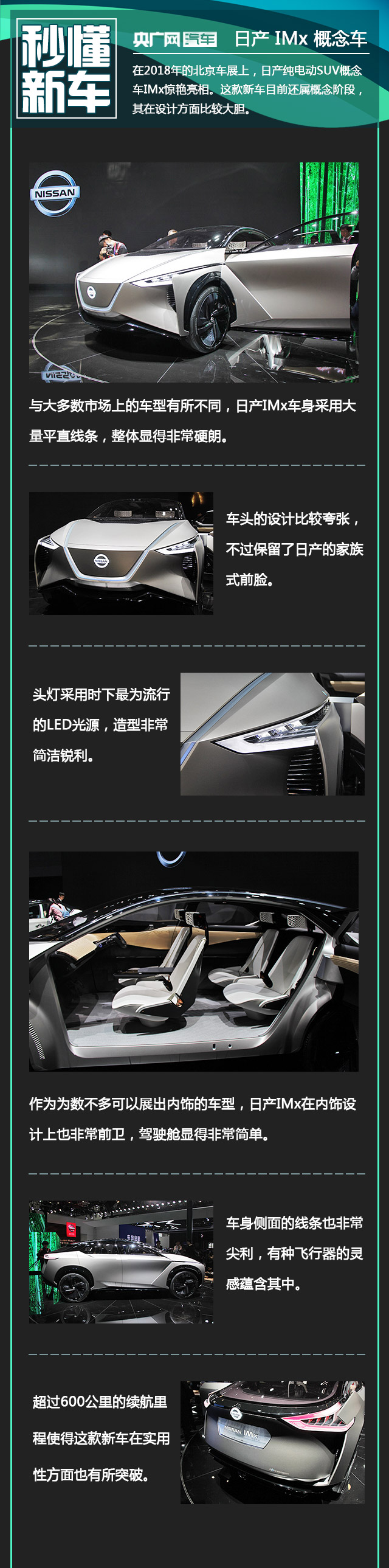 在2018年的北京車展上,日產(chǎn)純電動(dòng)SUV概念車IMx驚艷亮相。這款新車目前還屬概念階段,其在設(shè)計(jì)方面比較大膽。