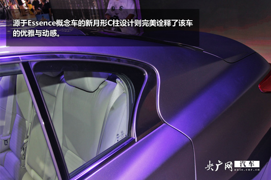 車身正側(cè)線條修長(zhǎng)舒展,頭部?jī)?nèi)斂,源于Essence概念車的新月形C柱設(shè)計(jì)則完美詮釋了該車的優(yōu)雅與動(dòng)感。新車尾部略向后突出,有著時(shí)刻準(zhǔn)備沖刺蓄勢(shì)待發(fā)之姿,“東風(fēng)英菲尼迪”以及“Q50L”標(biāo)識(shí)則表明了該車的具體身份。車尾輪廓鮮明但沒有車頭明顯的攻擊感,修長(zhǎng)扇形的紅色尾燈以及雙邊單出的圓形排氣筒令人賞心悅目。