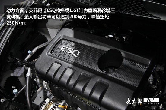 動(dòng)力方面,英菲尼迪ESQ將搭載1.6T缸內(nèi)直噴渦輪增壓發(fā)動(dòng)機(jī),最大輸出功率可以達(dá)到200馬力,峰值扭矩250N·m。傳動(dòng)部分,與之匹配的將是一臺(tái)CVT無(wú)級(jí)變速箱。此外該車(chē)還將配備適時(shí)四驅(qū)系統(tǒng)。
