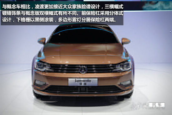 與概念車相比,凌渡更加接近大眾家族臉譜設(shè)計,三橫幅式鍍鉻飾條與概念版雙橫幅式有所不同。前保險杠采用分體式設(shè)計,下格柵以黑側(cè)涂裝,多邊形霧燈分居保險杠兩端。前大燈組采用遠近光一體式氙氣大燈。上海大眾凌渡的單腰線十分干練,多幅輪轂與概念車相比缺少一些運動風。
