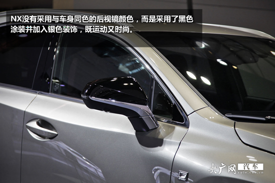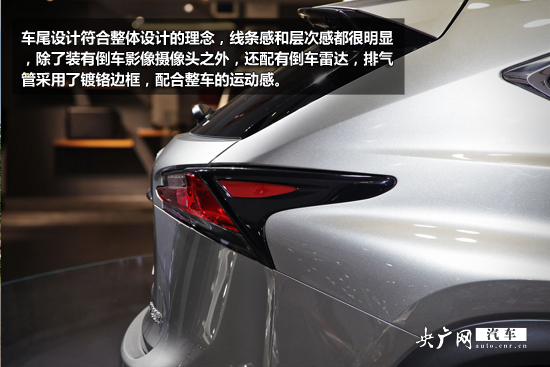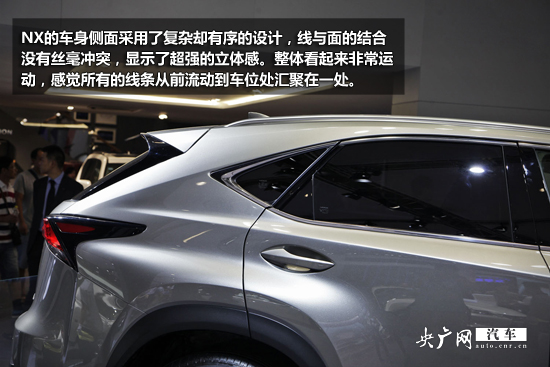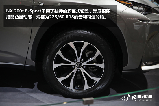 NX的車身側(cè)面采用了復(fù)雜卻有序的設(shè)計(jì),線與面的結(jié)合沒(méi)有絲毫沖突,顯示了超強(qiáng)的立體感。整體看起來(lái)非常運(yùn)動(dòng),感覺(jué)所有的線條從前流動(dòng)到車位處匯聚在一處。NX沒(méi)有采用與車身同色的后視鏡顏色,而是采用了黑色涂裝并加入銀色裝飾,既運(yùn)動(dòng)又時(shí)尚。NX 200t F-Sport采用了獨(dú)特的多輻式輪轂,黑底銀漆搭配凸顯動(dòng)感,規(guī)格為225/60 R18的普利司通輪胎。