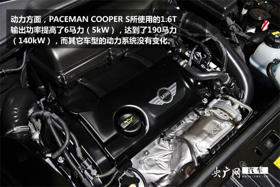 動力方面,PACEMAN COOPER S所使用的1.6T輸出功率提高了6馬力(5kW),達(dá)到了190馬力(140kW),而其它車型的動力系統(tǒng)沒有變化。
