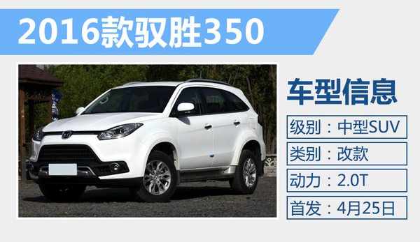 2016款馭勝S350將于今日發(fā)布售價正式上市,這將是一款搭載“4G”技術的全新產(chǎn),即:源自福特技術的Gtdi發(fā)動機(最大輸出功率為151千瓦,峰值扭矩為325牛·米)、全球研發(fā)平臺和安全架構、搭載具備人機交互功能的車載互聯(lián)系統(tǒng)。在換搭全新2.0T直噴渦輪增壓發(fā)動機后,馭勝S350的動力數(shù)據(jù)已經(jīng)超過了同排量的寶馬X3 sDrive20i(低功率版)。