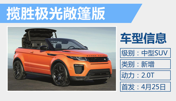 路虎攬勝極光敞篷版于今日車展首發(fā),該車預計起售價為65萬元。新車搭載2.0T汽油發(fā)動機,推出SE與HSE兩個版本車型,在車身顏色方面將有多達13種選擇。作為2016款攬勝極光的衍生車型,極光敞篷版上市后同樣會進入國內(nèi)豪華中型SUV市場!暗孪等龔姟北捡Y、寶馬和奧迪目前在該領域均有布局相應的產(chǎn)品,但并無敞篷版車型推出。可自動開合的折疊軟頂、不輸同級別競品的動力以及全系標配的四驅(qū)系統(tǒng),這些都將成為極光敞篷版的最大賣點。豪華的內(nèi)飾、齊全的安全配置,在舒適性和娛樂性方面極光敞篷版并沒有妥協(xié),唯一可以挑剔的也許就只有稍顯“緊俏”的內(nèi)部空間了。