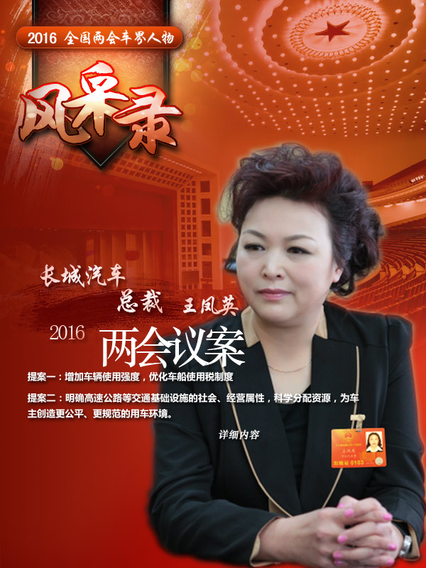 記者從長(zhǎng)城汽車(chē)股份有限公司獲悉,全國(guó)人大代表、長(zhǎng)城汽車(chē)總裁王鳳英提出了2016年她的兩會(huì)議案。