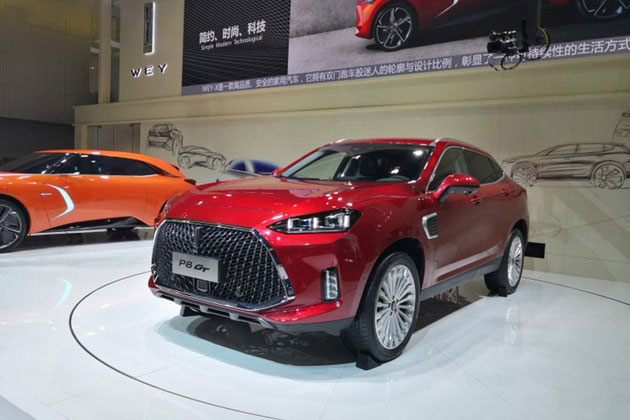 新車相較于WEY P8外觀造型更加時尚,加入了大量轎跑元素,采用大尺寸多邊形前格柵、雙邊共四出的排氣樣式。后備廂蓋左右分別標(biāo)有P8 GT以及“魏派”字樣。行車的尺寸為4790/1940/1672mm,軸距為2950mm。