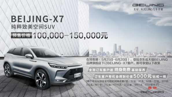 5月25日,BEIJING-X7“純粹致美探索日”探秘之旅,在全網100余平臺完成云端直播。北京汽車藍谷營銷服務有限公司總經理李一秀宣布BEIJING-X7全面開始接受預訂,預售價格為10-15萬元,預售政策包含終身免費保養(yǎng)和訂車得鉆戒等。