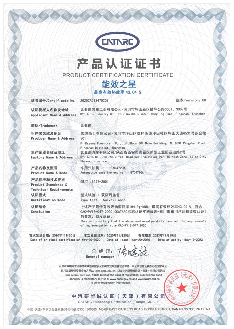 近日,比亞迪驍云-插混專用1.5L高效發(fā)動機獲得了中汽研華誠認證中心頒發(fā)的產品認證證書,以43.04%的熱效率獲得“能效之星”稱號。同時在廣州車展,比亞迪正式發(fā)布了首款DM-i超級混動轎車秦PLUS,搭載驍云-插混專用1.5L高效發(fā)動機,虧電狀態(tài)百公里3.8L的革命性油耗,在滿油滿電狀態(tài)下行駛里程可超過1000公里,完全顛覆用戶對傳統(tǒng)轎車的油耗認知。