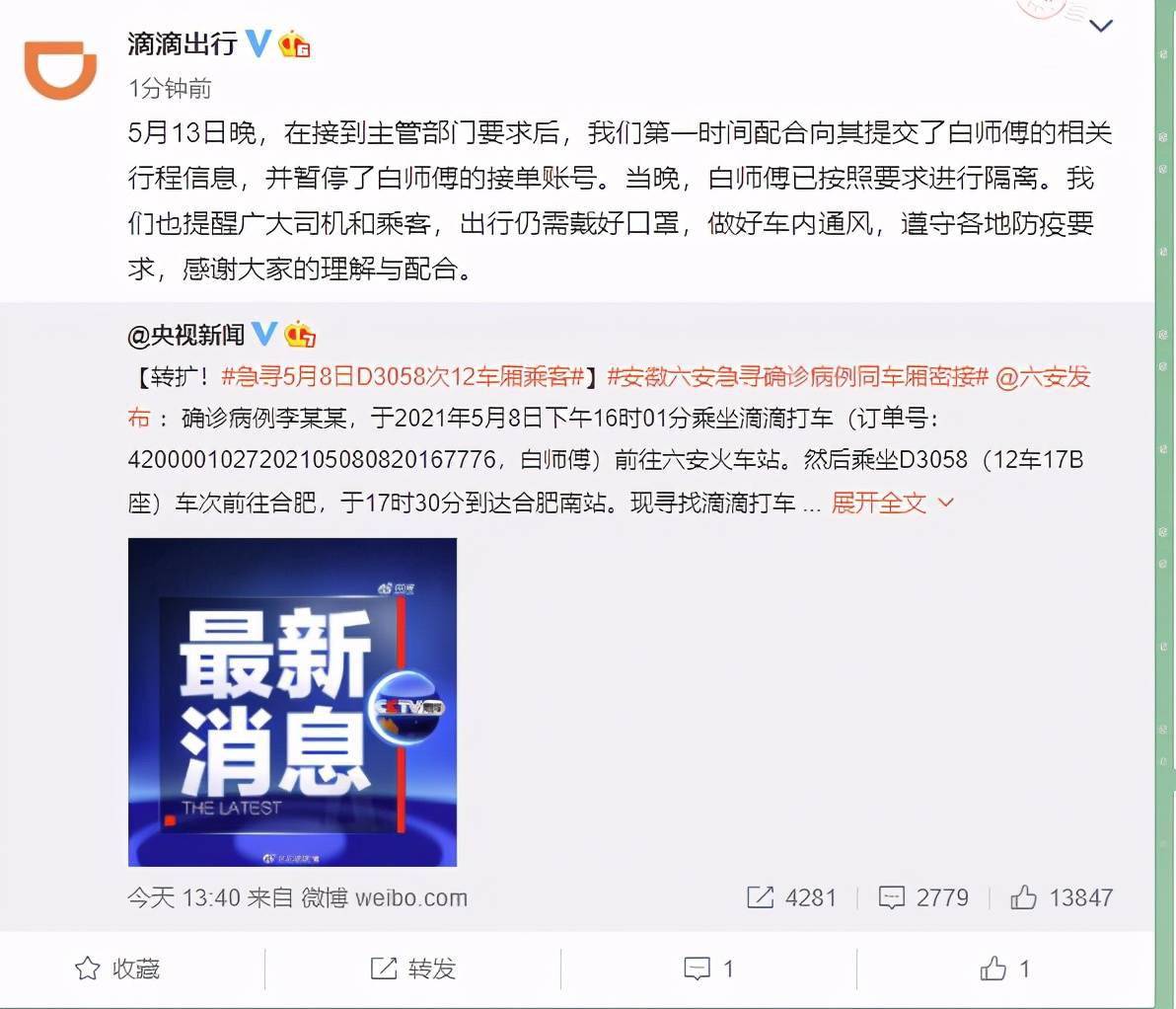 早前,@六安發(fā)布 微博通報,六安市裕安區(qū)疫情防控應(yīng)急指揮部辦公室公告稱,確診病例李某某,于2021年5月8日下午16時01分乘坐滴滴打車(訂單號:4200001027202105080820167776,白師傅)前往六安火車站。然后乘坐D3058(12車17B座)車次前往合肥,于17時30分到達合肥南站。