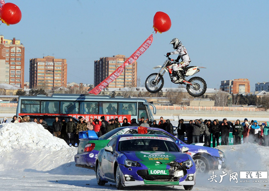 1月12日,來自大連的“亞洲新飛人”、柯受良弟子謝雨均駕駛一輛自重1.6噸的賽車,在零下四十度極寒氣候條件下,從中俄邊境城市——黑龍江省黑河市的大黑河島起飛,經過300米的跑道加速,飛越中國境內寬度約40米的黑龍江江面。由于目前黑龍江已經完全封凍,所以這次行動的主題命名為“飛越冰河”。