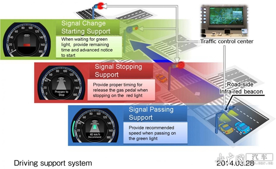 當(dāng)駕駛車輛即將到達(dá)十字路口時(shí),該系統(tǒng)會向駕駛者建議車速,如果是綠燈,系統(tǒng)將推薦車主提速通過;如果綠燈即將結(jié)束,而車輛沒有足夠時(shí)間通過,系統(tǒng)將提示需減速等待;如果需停車等待紅燈,系統(tǒng)會在儀表盤顯示進(jìn)入綠燈時(shí)間的倒計(jì)時(shí),從而關(guān)聯(lián)到發(fā)動(dòng)機(jī)啟停。豐田公司表示,這一系統(tǒng)可以有效的提高燃油經(jīng)濟(jì)性并減少二氧化碳排放量,研究人員還透露,這一系統(tǒng)或?qū)⒂绊戃囕v行駛和交通安全。(央廣汽車:郭文靜)
