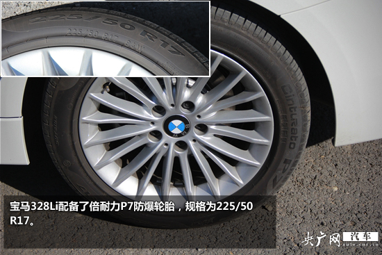 寶馬328Li豪華版車型采用了多幅輪轂,類似于螺旋槳造型,輪胎采用的是倍耐力的防爆輪胎,尺寸為225/50 R17。