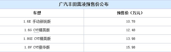 廣汽豐田雷凌發(fā)布 預(yù)售10.78-15.98萬(wàn)