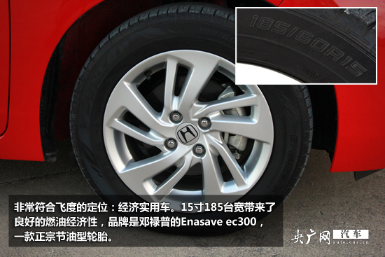 本次試駕車型雖為頂配,但輪胎輪轂選擇非常保守,當(dāng)然這非常符合飛度的定位:經(jīng)濟(jì)實(shí)用車。15寸185臺(tái)寬帶來了良好的燃油經(jīng)濟(jì)性,品牌是鄧祿普的Enasave ec300,一款正宗節(jié)油型輪胎。其實(shí)飛度在國內(nèi)是改裝車迷的摯愛,換裝輪胎輪轂玩出個(gè)范兒還是很方便的。