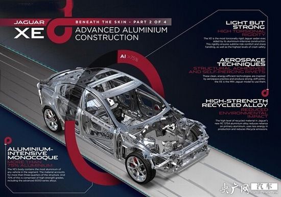 全新捷豹XE車身采用了大量復合材料,鋁合金材料的使用率將近75%,在降低車身重量的同時還提升了車身的剛度。這款新車也是首款使用高強度鋁材料“RC5754”的車型。