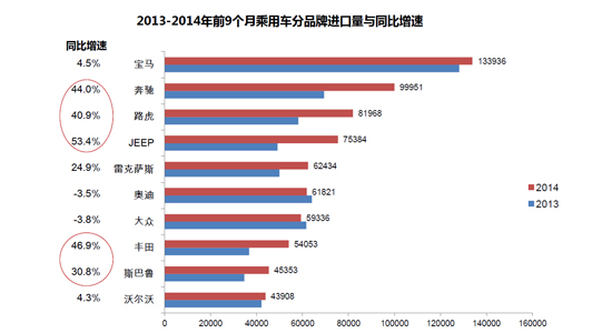 奔馳、路虎、JEEP、豐田、斯巴魯增長(zhǎng)迅猛,進(jìn)口車型的國(guó)產(chǎn)影響寶馬、奧迪和沃爾沃的進(jìn)口車市場(chǎng)表現(xiàn)。