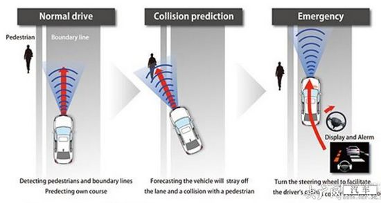 該系統(tǒng)包含以下五種功能: 1.碰撞緩解制動系統(tǒng)(Collision Mitigation Braking System)當(dāng)系統(tǒng)檢測到正面碰撞可能時(shí),碰撞緩解制動系統(tǒng)將通過聲音和圖標(biāo)發(fā)出警示。如果駕駛者沒有采取措施避免碰撞,將自動施加制動,避免碰撞或者降低碰撞損失。 2.車道偏離警示系統(tǒng)(Road Departure Mitigation System)車道偏離警示系統(tǒng)利用攝像頭監(jiān)測車輛是否偏離車道,若偏離車道,方向盤會出現(xiàn)振動,并發(fā)出聲音報(bào)警。如果駕駛者沒有采取措施補(bǔ)救,車輛將自動施加制動,防止車輛沖出路面。 3.行人碰撞緩解轉(zhuǎn)向系統(tǒng)(Pedestrian Collision Mitigation Steering System)行人碰撞緩解轉(zhuǎn)向系統(tǒng)利用雷達(dá)和攝像頭監(jiān)測行人,以及“隔離帶邊界線”。當(dāng)系統(tǒng)檢測到車輛可能撞到行人或者中間隔離帶時(shí),將自動轉(zhuǎn)向避開行人和隔離帶,防止碰撞。 4. 起步防撞功能(False Start Prevention Function)起步防撞能防止因?yàn)槠鸩郊铀龠^快追尾前方車輛。例如在燈光信號前,該系統(tǒng)能夠自動監(jiān)測前方車輛,通過聲音和圖標(biāo)發(fā)出警示,油門踏板也將出現(xiàn)振動。 5.前車起步提醒系統(tǒng)(Lead Car Departure Notification)前車起步提醒系統(tǒng)在交通信號燈前或者擁堵等狀況下,當(dāng)前方車輛起步時(shí),系統(tǒng)會通過聲音和圖標(biāo)提醒駕駛者。