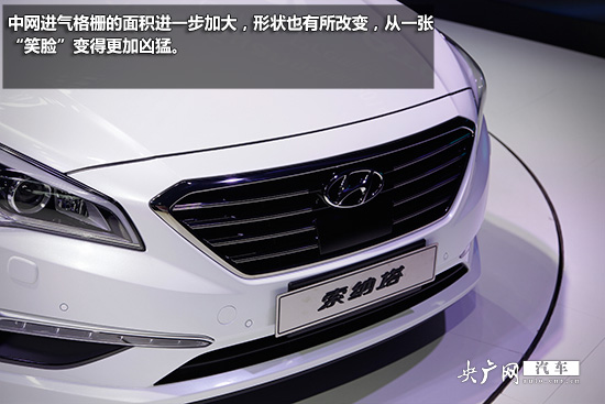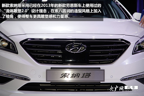 新款索納塔采用已經(jīng)在2013年的新款勞恩斯車上使用過的“流體雕塑2.0”設(shè)計理念,在索八圓潤的造型風(fēng)格上加入了棱角,使得整車更具雕塑感和力量感。中網(wǎng)進(jìn)氣格柵的面積進(jìn)一步加大,形狀也有所改變,從一張“笑臉”變得更加兇猛。