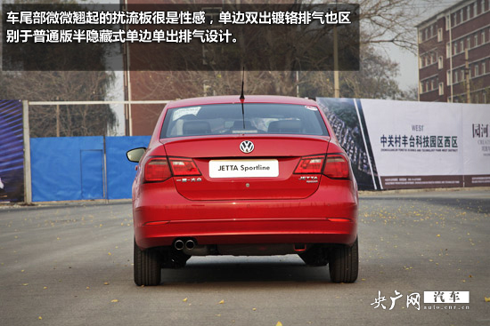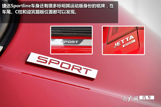 車尾部微微翹起的擾流板很是性感,單邊雙出鍍鉻排氣也區(qū)別于普通版半隱藏式單邊單出排氣設(shè)計(jì)。捷達(dá)Sportline車身還有很多標(biāo)明其運(yùn)動版身份的銘牌,在車尾、C柱和迎賓踏板位置都可以發(fā)現(xiàn)。
