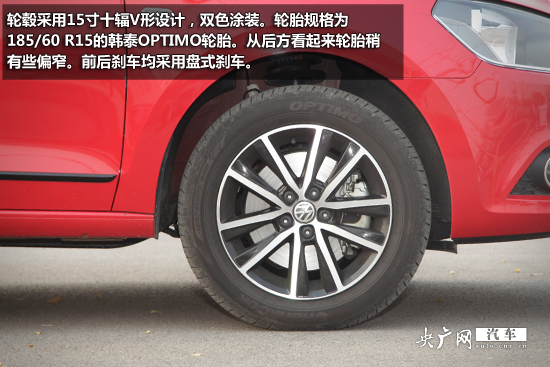輪轂采用15寸十輻V形設(shè)計(jì),還采用了雙色涂裝。與之搭配的輪胎規(guī)格為185/60 R15的韓泰OPTIMO輪胎。從后方看起來輪胎稍有些偏窄,似乎與其運(yùn)動版的身份不搭。剎車方面與普通版捷達(dá)的前盤后鼓式不同的是前后均采用盤式剎車。