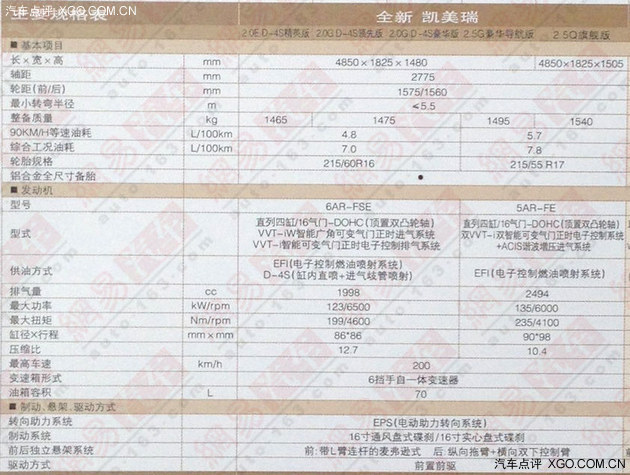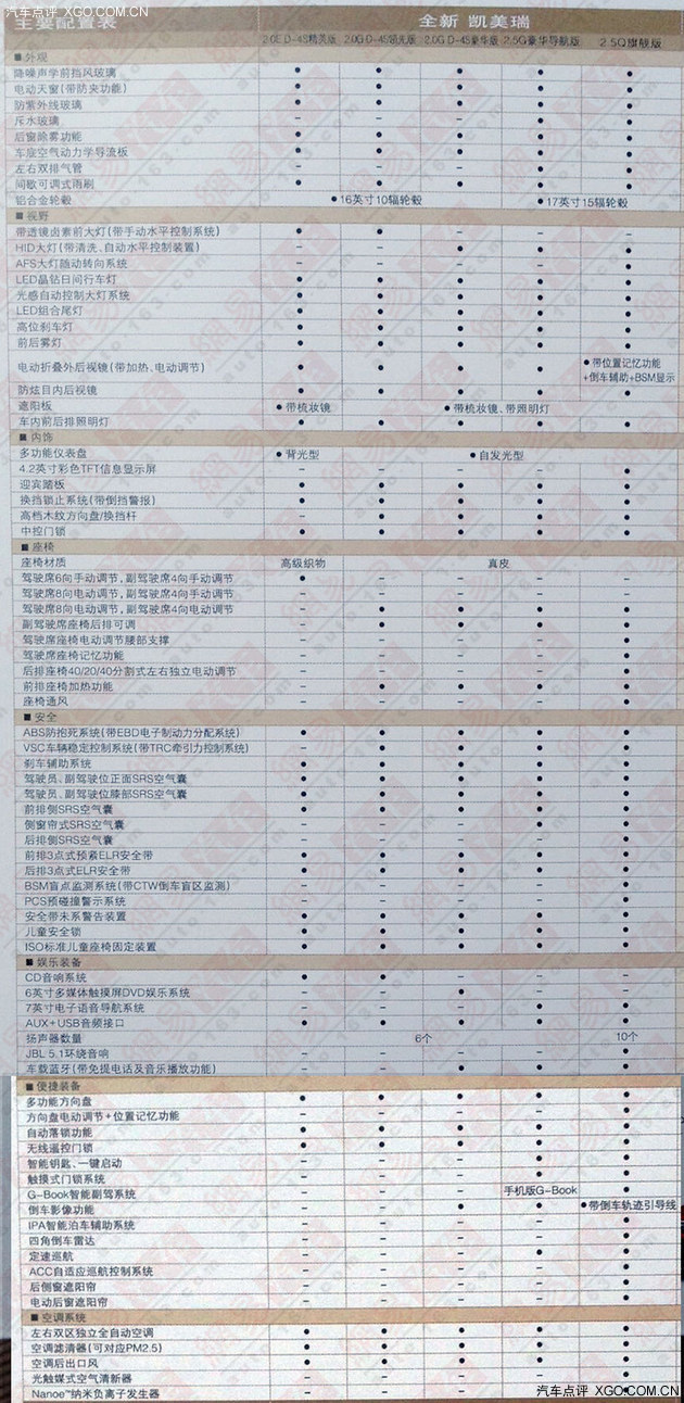 廣汽豐田新款凱美瑞已經(jīng)正式發(fā)布,新款車型將在2014年12月陸續(xù)到店,并于2015年1月正式上市。近日,我們從相關(guān)渠道獲得了新款凱美瑞的詳細(xì)配置