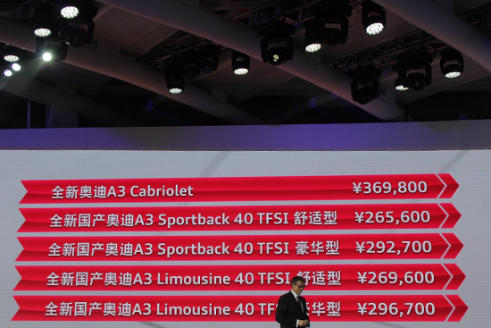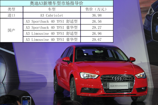 2015年1月27日,奧迪A3家族新增五款車型,分別為一汽-大眾奧迪A3 40 TFSI Sportback(兩廂)舒適/豪華型、Limousine(三廂)舒適/豪華型、進(jìn)口奧迪A3 Cabriolet(軟頂敞篷)車型。其中國(guó)產(chǎn)車型售26.56萬-29.67萬元,進(jìn)口敞篷車型售36.98萬元。具體售價(jià)如下: