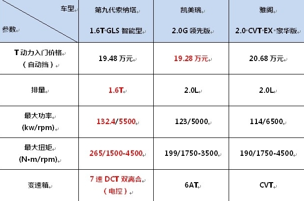 首先,一般買車都先從動(dòng)力看起,而作為最新上市的第九代索納塔,在動(dòng)力層面可以說完勝兩個(gè)對手,其搭載1.6T渦輪增壓缸內(nèi)直噴發(fā)動(dòng)機(jī),匹配7DCT雙離合變速器,可以更好地減少動(dòng)力傳遞損耗,換擋提速平順,綜合油耗百公里也僅為6.9L,可謂最先進(jìn)的黃金動(dòng)力組合。反觀日系雙雄,這兩款產(chǎn)品在最大功率、最大扭矩上都和索九1.6T有巨大差距,賬面數(shù)據(jù)一目了然。