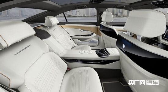 內(nèi)飾方面,概念車采用了灰白雙色拼接的內(nèi)飾,并輔以棕色飾板。此外,車內(nèi)配備了 多功能方向盤,中控臺以及儀表盤均采用了大尺寸液晶屏,搭配集合型檔桿。另外,為了提高舒適性,概念車后排采用了兩個獨立后排座椅。