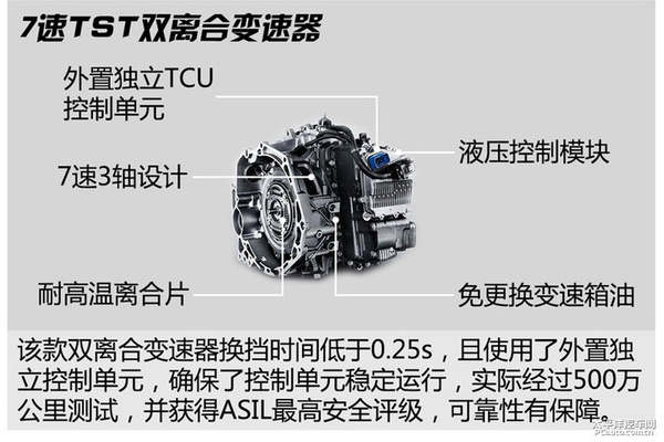 搭配在1.4T發(fā)動(dòng)機(jī)上的是7速雙離合變速器,該變速器使用了外置獨(dú)立的TCU控制單元,能確?刂茊卧(wěn)定運(yùn)行,此外離合片采用特殊材料設(shè)計(jì),耐熱溫度高達(dá)500°c,能更好地應(yīng)對(duì)中國城市頻繁起步的擁堵路況。上汽方面已經(jīng)對(duì)該變速器進(jìn)行了500萬公里的全國道路測(cè)試,在可靠性方面更有保證。