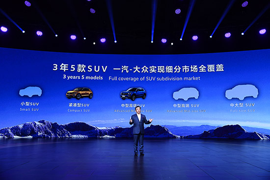 在未來的3年內,一汽-大眾將會密集推出5款SUV產品,實現(xiàn)從小型、緊湊型、中型到中大型細分市場的全覆蓋,而這將會改觀一汽大眾一直以來存在的“SUV荒”。