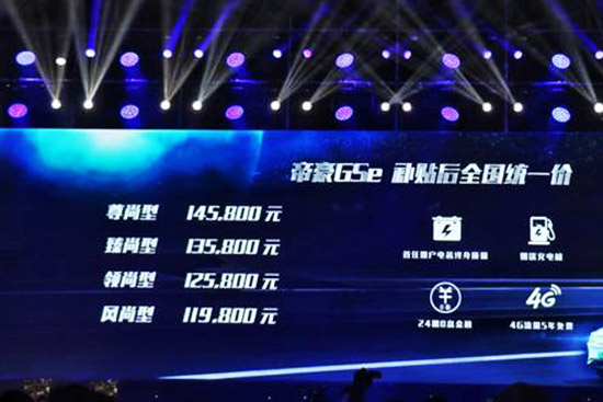 央廣網北京6月9日消息(記者葛成)今晚,吉利汽車旗下全新純電動SUV帝豪GSe在北京昆侖決世界搏擊中心正式上市。新車共提供了四種不同的配置類型,補貼后售價為11.98-14.58萬元。
