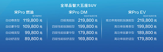 央廣網(wǎng)北京7月12日消息(記者李尚)11日,比亞迪宋Pro在國家游泳中心(水立方)正式上市。新車共有燃油、插電式混動、純電三大動力,共計12款車型重磅登場,其中,宋Pro燃油官方指導(dǎo)價8.98萬-11.98萬元;宋Pro DM綜合補貼后價格16.98萬-21.98萬元;宋Pro EV綜合補貼后價格17.98萬-21.98萬元。官方售價明細如下: